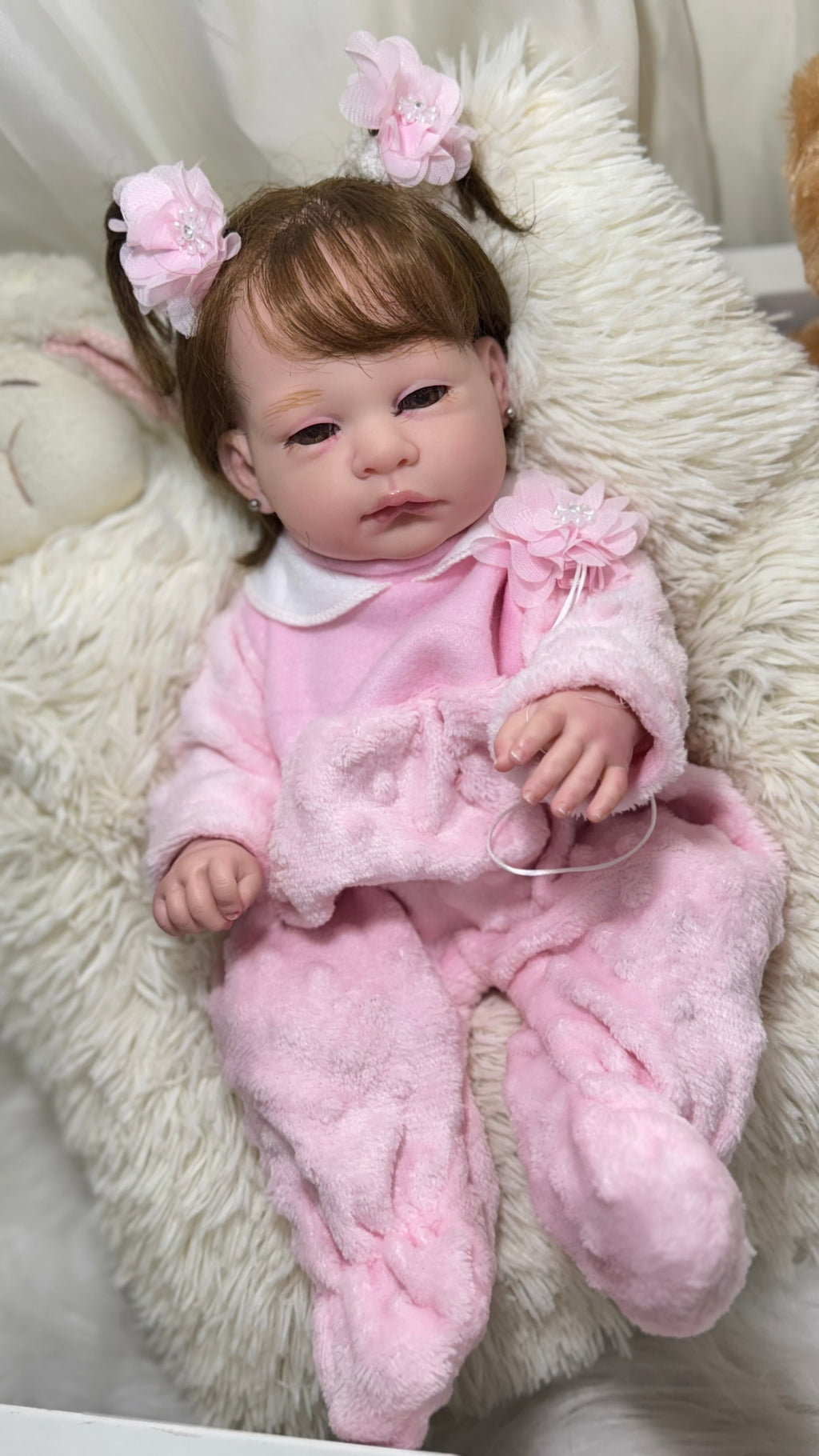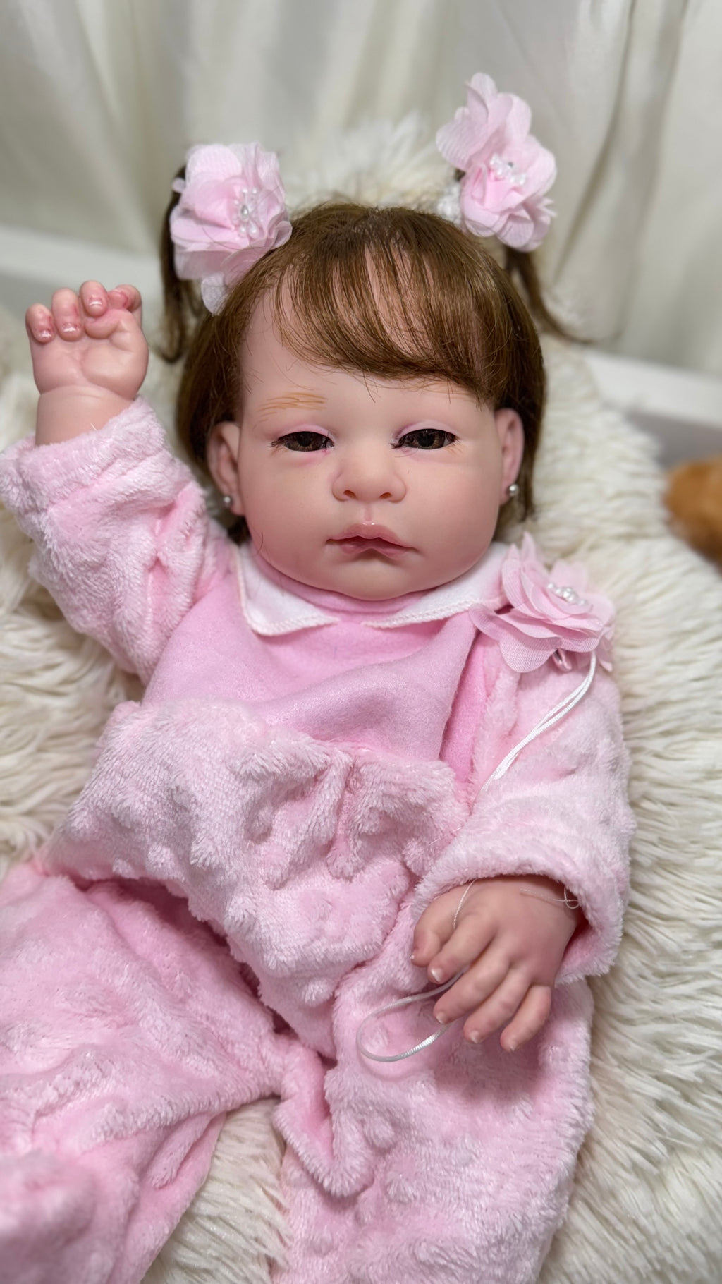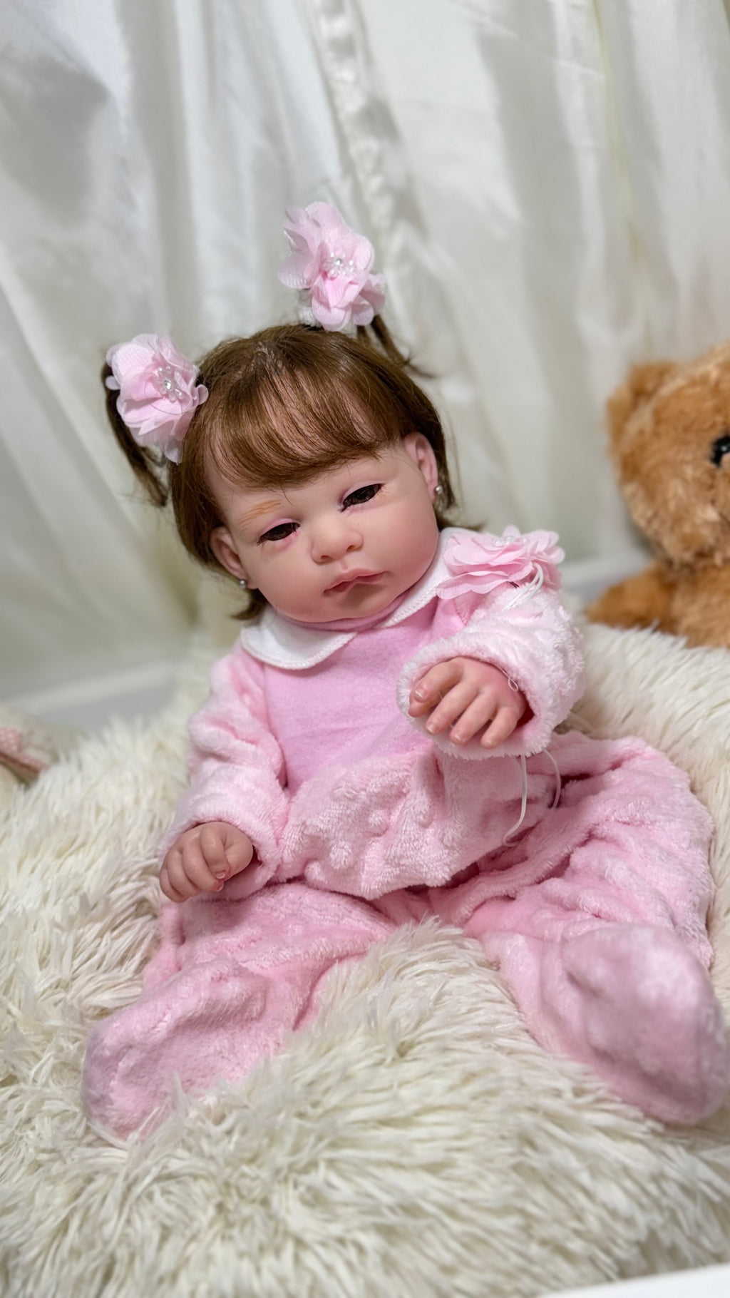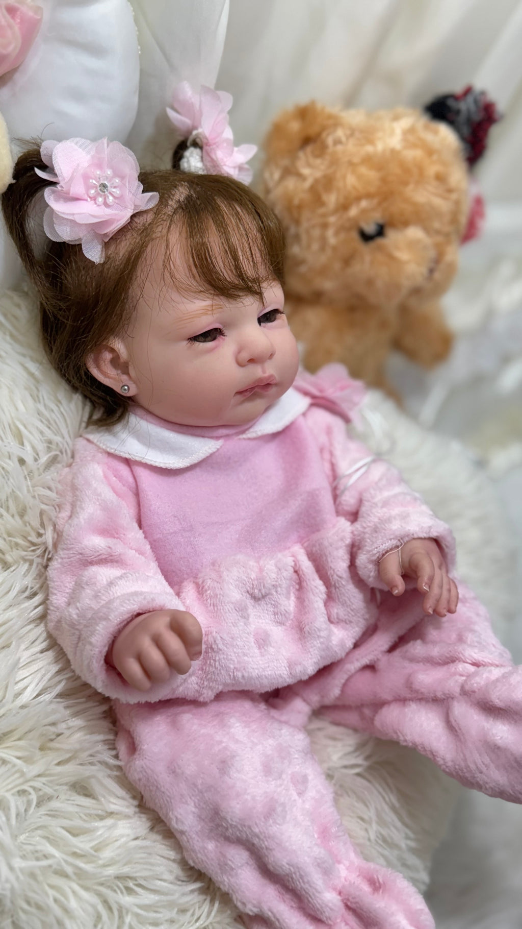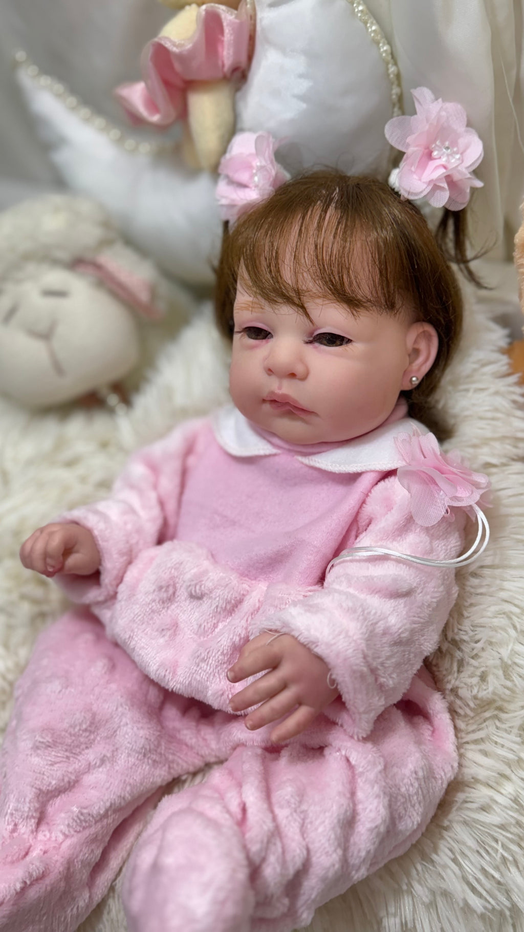 Maria Flor é perfeita para quem deseja sentir a emoção de cuidar, vestir e embalar um bebê que parece real. Seus detalhes delicados e o toque natural da pele fazem dela uma verdadeira joia da arte reborn.